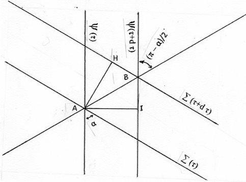 Ce croquis représente le plan parallèle aux méridiens qui contient les positions A et B d'un photon aux dates tau et tau + d.tau du temps de l'univers E2. Ont été dessinées les traces, à ces 2 dates, de l'onde brogienne PSIassociée à ce photon, onde qui est parallèle aux méridiens (page 8), et celles de l'onde-univers SIGMA qui fait un angle alpha avec les méridiens. H et I sont les projections orthogonales du point A sur les traces de SIGMA et de PSI à la date tau+d.tau. Comme localement toutes les ondes de type S se propagent à la même vitesse dans l'éther, AH = AI et par suite HB = IB. Or H est la position du point A à la date tau + d.tau, et par suite HB est le chemin parcouru par le photon pendant le temps d.tau. IB est le temps propre (mesurable par un observateur) qu'a duré ce parcours, et relativement à l'onde SIGMA, la vitesse du photon est donc :
