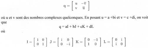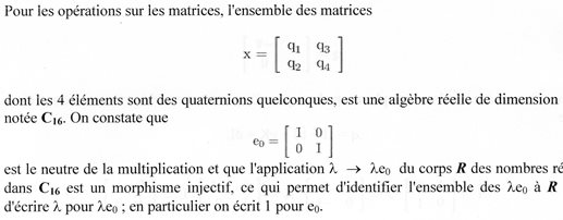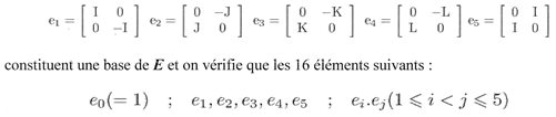 Annexe B - L'algèbre de Clifford C16 Je veux simplement décrire ici les raisonnements qui m’ont conduit à émettre l’hypothèse de la réalité physique d’un univers à 5 dimensions. Les quaternions peuvent être définis comme étant les matrices
